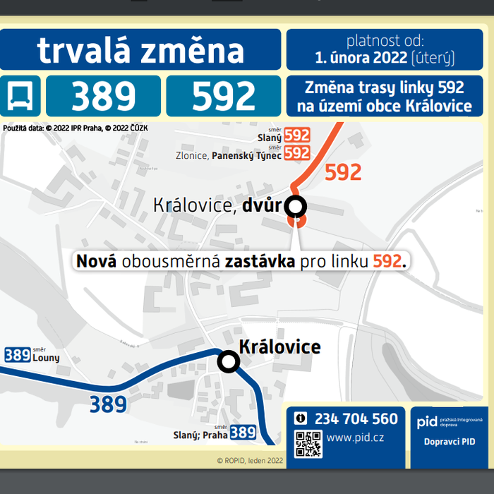 Informujeme občany, že od 1. 2. 2022 se linka 592 ze zastávky „Královice“ přesouvá do nové zastávky „Královice, dvůr“ (před jezdeckým areálem Královický dvůr).