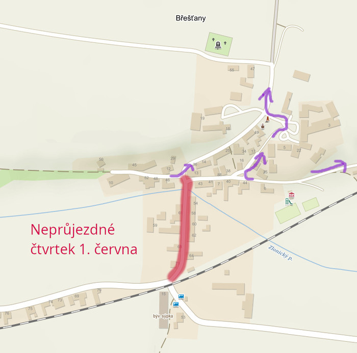 Dne 1. června bude asfaltovaný úsek v Břešťanech od železničního přejezdu po křižovatku za mostem. Tento den bude od 7-18 hod úsek zcela neprůjezdný. Pokud budete potřebovat vaše vozidlo, zaparkujte jej v předstihu na vhodném v místě v okolí. Třeba u autobusové zastávky nebo někde za mostkem. Aby asfaltový povrch dobře zatuhl, vychladl a zpevnil se, pokud to bude možné, neotáčejte se na něm během večera po otevření. Využijte jej pak jen k průjezdu.