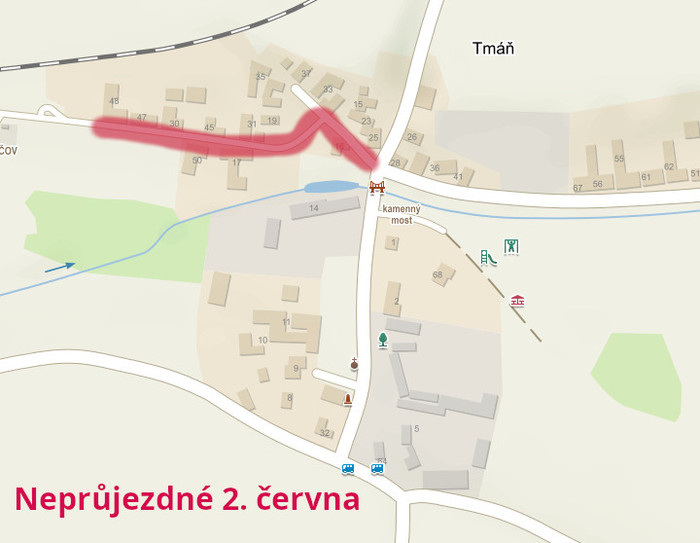 Dne 2. června bude asfaltovaný úsek ve Tmáni od mostku až k poslednímu domu směrem k ČOV, tedy směr Břešťany. Tento den bude úsek zcela a bez výjimek neprůjezdný od 7-18 hod. Pro parkování využijte prostor ve středu Tmáně, kde bývá volební buňka, případně točnu před ČOV a projedete kolem nádraží do Břešťan. Nebo samozřejmě jiné vhodné místo. Večer po položení se prosím opět na novém asfaltu neotáčejte, jen volně projíždějte aby mohl asfalt správně vychladnout a ztuhnout.